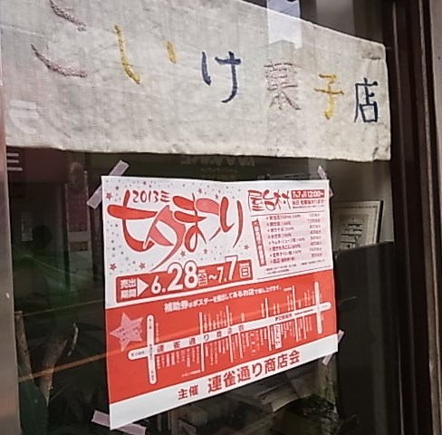 そして、連雀通り商店街では毎年、七夕まつりを開催しています。今年は7月7日(日)。いろんな屋台が出るのですが、現在、そこで使える補助券を、商店街にある参加店で差し上げています。(参加店には写真のポスターが掲示してあります)お店によって、もらえる条件は違うのですが、当店では400円につき1枚差し上げています。(よく渡し忘れるので、欲しい方は申告してくださるとうれしいです(苦笑))補助券をたくさん集めて、七夕まつりをお楽しみください。